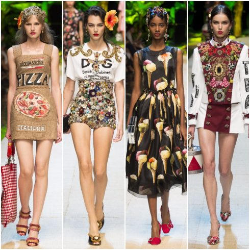 Dấu ấn châm biếm thể hiện trên nhiều thiết kế. Đó là áo t-shirt in dòng chữ Docce & Gabinetti mô phỏng tên gọi của bộ đôi NTK Domenico Dolce & Stefano Gabbana; hình ảnh những bó mì spaghetti của Ý, vỏ ốc quế của món kem Gelato huyền thoại cũng được hiện diện trên các bộ đầm bó, ôm sát lấy hình thể người mặc.