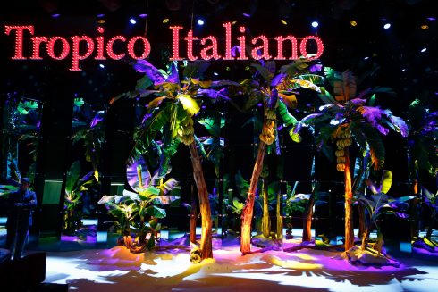 Sàn diễn chính kết nối sân khấu được thiết kế như khu vườn nhiệt đới với hàng cây dừa, cọ. Dòng chữ “Tropico Italiano” (tạm dịch: miền nhiệt đới nước Ý) miêu tả nắng, gió nơi những cuộc vui của nam thanh nữ tú hòa quyện cùng âm nhạc và điệu nhảy Tarantella.