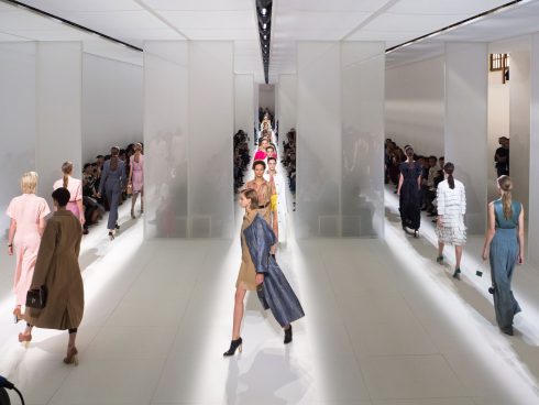 Không gian khán phòng trình diễn được thiết kế đề cao yếu tố liên hoàn mang phong cách tối giản, tách biệt bởi những tấm vách ngăn to bản màu trắng có thể nhìn xuyên thấu từng khán phòng. Sàn trình diễn phủ sơn trắng đồng điệu với màu sắc của vách ngăn và bức tường xung quanh giúp hướng trọn vẹn mọi sự chú ý đến các thiết kế trang phục.