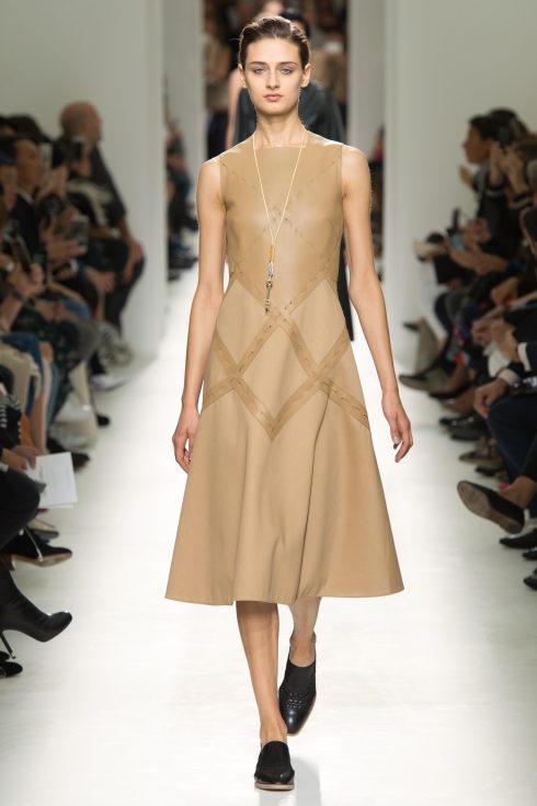 Chất liệu da chủ đạo được biến tấu lạ mắt trên bề mặt ứng dụng kỹ thuật cắt, ráp nối ấn tượng không chỉ thể hiện kỹ thuật may vá đỉnh cao mà còn khéo léo nhắc nhở về giá trị di sản của nhà mốt Hermès – ngành chế tác đồ da. Dấu ấn này hiện diện trên mẫu áo khoác dài liền váy, áo ba lỗ khoét nách, hay thiết kế skirt suit gồm áo khoác và chân váy.