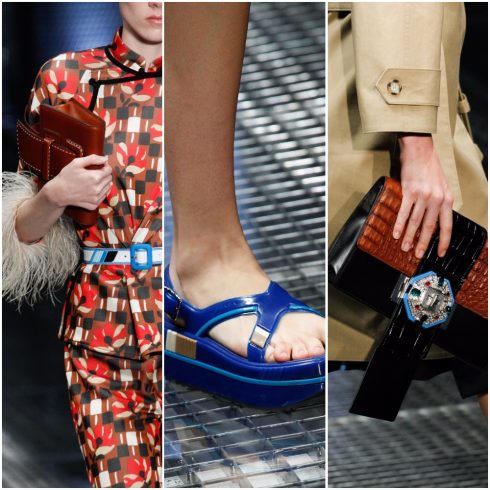 Mẫu giày chủ đạo là những đôi sandals đế bệt và đế xuồng bằng chất liệu da bóng hoặc nhựa dẻo được trang trí bằng những họa tiết hình hoa đặc sắc. Kết hợp cùng với đó là các mẫu túi xách tay làm từ chất liệu da cao cấp thêm điểm nhấn họa tiết Op Art đặc trưng của nghệ thuật thị giác. Phụ kiện nữ trang đi kèm chính là dây chuyền bản to nhiều màu sắc.