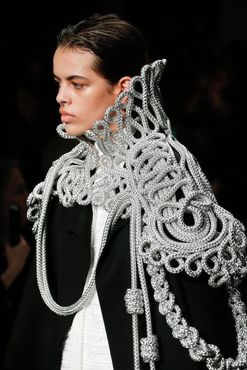 Với màn kết, người mẫu khoác lên mình những mẫu áo choàng kiểu cape tuyệt đẹp được thiết kế tinh xảo. Bề mặt chất liệu trở thành tấm toan giàu tính nghệ thuật nơi những người thợ thủ công xâu chuỗi hoặc đính những chi tiết trang trí như ngọc trai, pha lê, hạt cườm, dây xích.