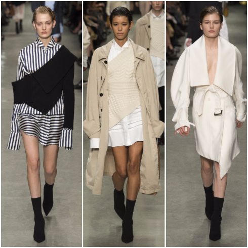 Mẫu đầm bất cân xứng, áo sơmi trắng dài tay với gấu tay được cường điệu hóa, áo len chui đầu bố cục thách thức mọi quy chuẩn truyền thống, áo trench trứ danh ngoại cỡ là những điểm nhấn đầy thú vị. Ở phần kết, áo choàng kiểu cape đính đá trang sức kỳ công đẹp hoàn hảo.