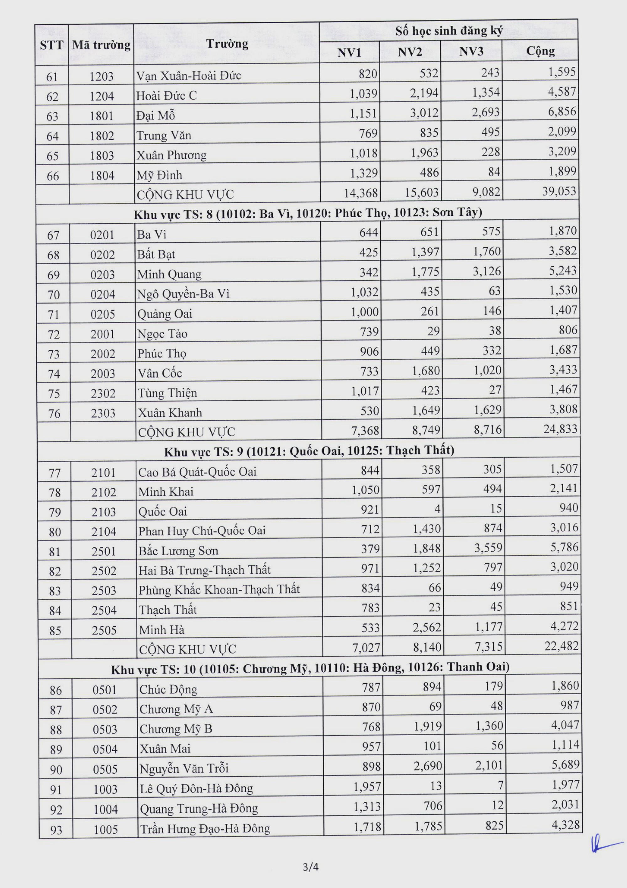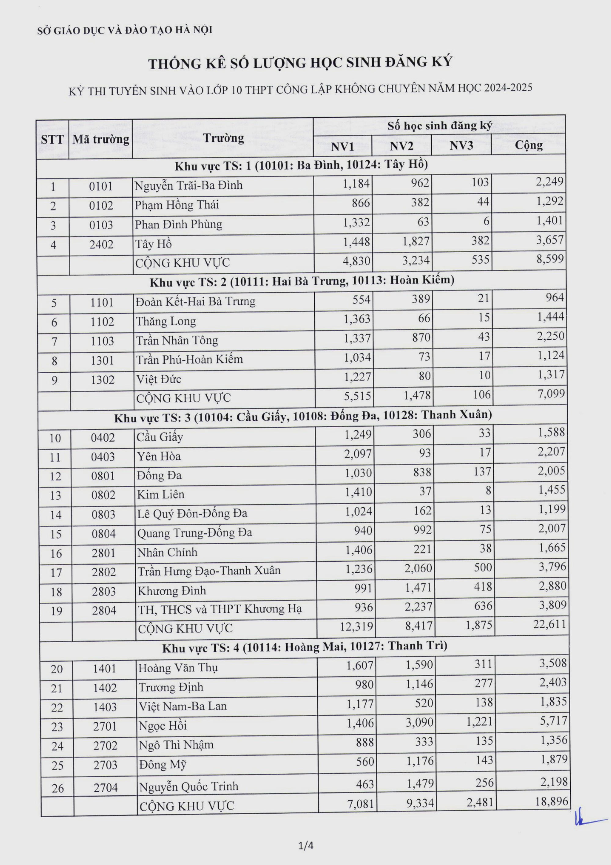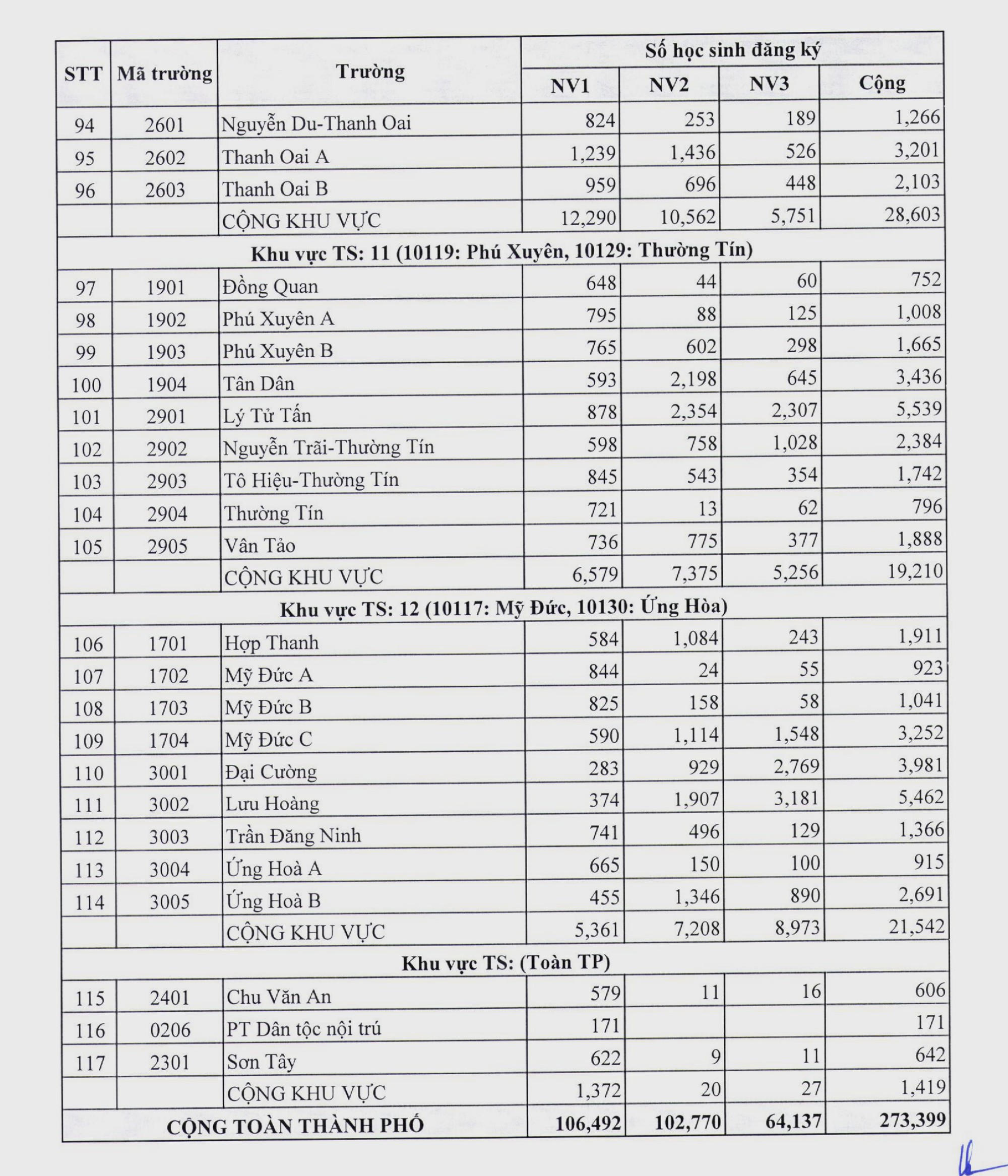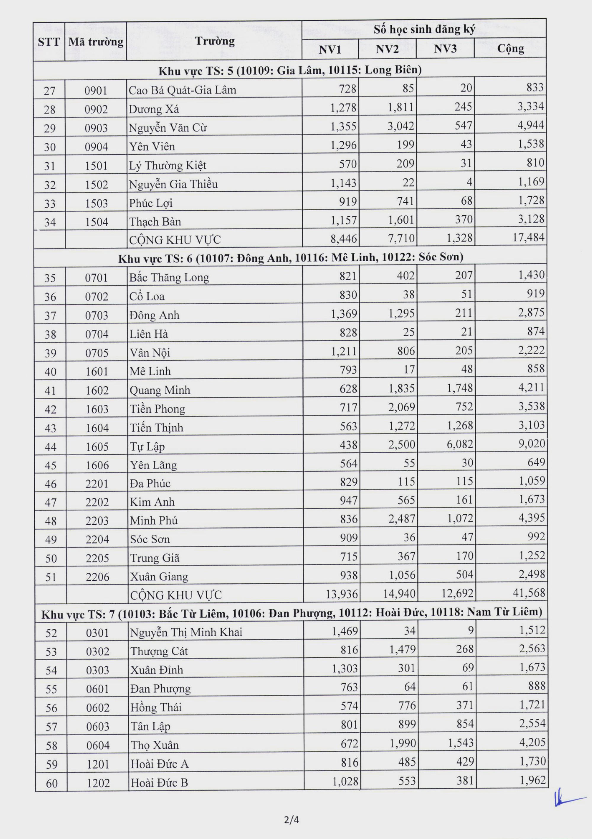 Chi tiết số lượng học sinh đăng ký vào từng trường THPT công lập không chuyên như sau: