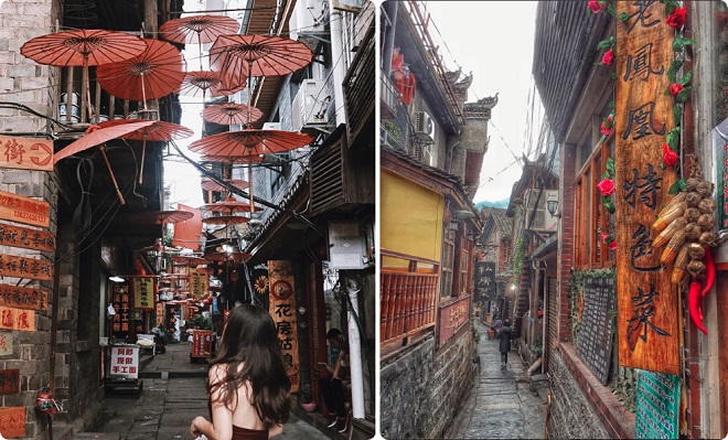 Ngoài cây cầu đá nhảy độc đáo, những con phố giăng đầy đèn lồng và những chiếc dù nan tre màu đỏ cũng là điểm nhấn đặc biệt của ngôi làng cổ Phượng Hoàng. Đây cũng là nét đặc trưng nhuốm màu Trung Hoa. Dạo bước trên nền gạch ẩm ướt, lướt tay trên những bức tường đá rêu phong, bạn như đang lạc vào một bộ phim cổ trang liêu trai đầy ma mị.