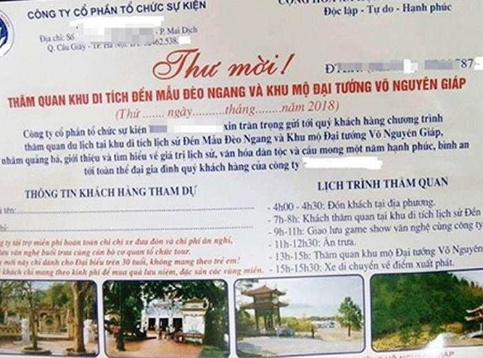 Theo thông tin một số cựu binh tại Nghệ An, Hà Tĩnh cung cấp, họ được một số công ty du lịch mời đi tham quan các địa điểm di tích lịch sử cách mạng trong dịp tháng 7 để “tri ân những anh hùng liệt sỹ”. Sau khi ăn bữa cơm trưa miễn phí, các hội viên sẽ được các thành viên trong công ty chia thành các nhóm nhỏ tổ chức giới thiệu sản phẩm và bán hàng. Vì nể được mời đi du lịch lại ăn cơm miễn phí, lại nhận được lời mời chào giới thiệu sản phẩm “ưu việt, có nhiều tính năng, rẻ hơn thị trường”… nên nhiều cựu binh đã trút hầu bao mua sản phẩm. Tuy nhiên, khi về nhà họ mới biết đó là những sản phẩm rẻ tiền, được “đội” giá lên cao gấp 3 - 4 lần, hoặc không có các tính năng như giới thiệu.