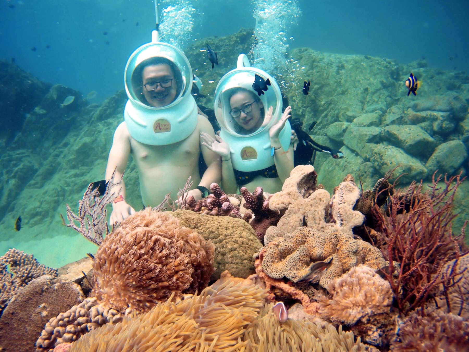 Cặp đôi thích thú khi được nặn xuống đáy biển để ngắm những rạn san hô và những đàn cá màu sắc.