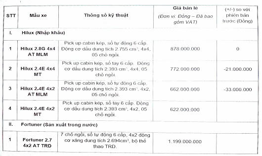 Theo đó, một số phiên bản của Hilux sẽ được điều chỉnh giảm giá từ 21 triệu đồng đến 33 triệu đồng so với mức giá hiện tại.