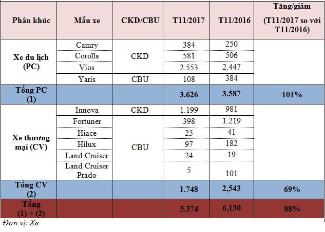 Trong khi đó, nhờ nỗ lực điều chỉnh giá bán lẻ mới cho năm 2018 áp dụng với các mẫu xe lắp ráp trong nước, có hiệu lực kể từ ngày 01/11/2017, hỗ trợ cho những khách hàng có nhu cầu thực sự có thể đưa ra được quyết định mua xe trong năm nay thay vì chờ đợi, doanh số bán hàng của Công ty Ô tô Toyota Việt Nam (TMV) trong tháng 11 (không bao gồm Lexus) đạt 5.374 xe, giảm 12% so với cùng kỳ năm 2016 (tăng trưởng 22% so với tháng 10/2017).