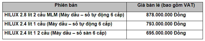 Hilux phiên bản cải tiến 2018 cung cấp 3 lựa chọn cho khách hàng với mức giá như sau: