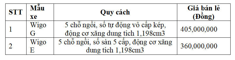 Mức giá trên đã bao gồm 10% thuế giá trị gia tăng và được áp dụng với mẫu xe Toyota Wigo mới, xuất hóa đơn từ ngày 06/06/2023 trên toàn quốc. |