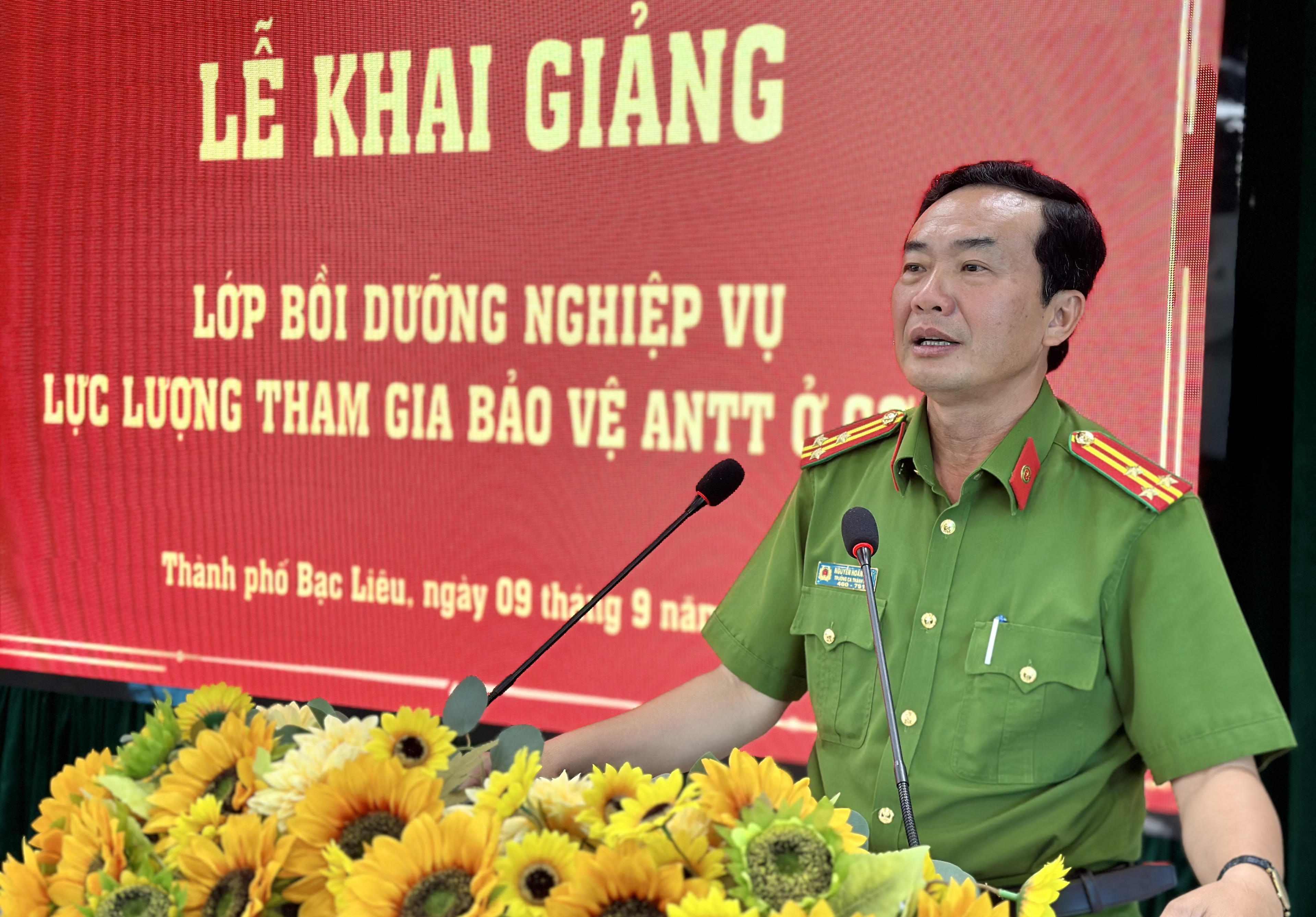 Thượng tá Nguyễn Hoàng Ân - Trưởng Công an thành phố Bạc Liêu phát biểu khai giảng lớp bồi dưỡng nghiệp vụ. |