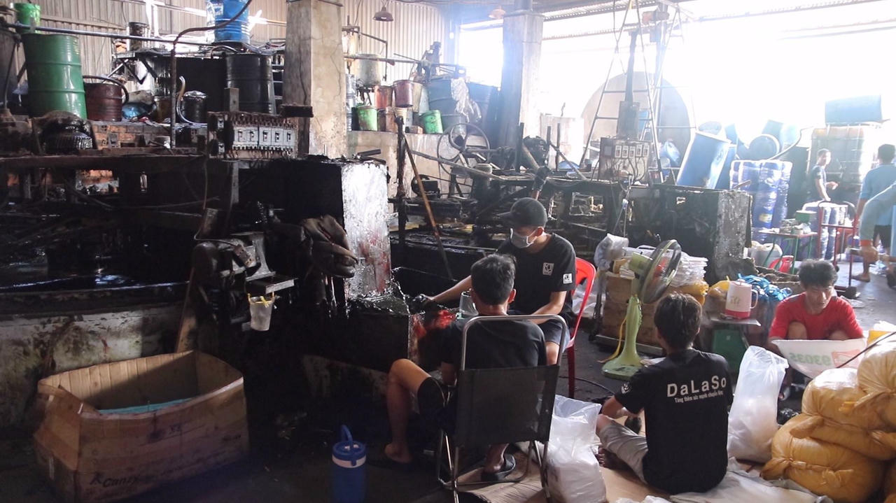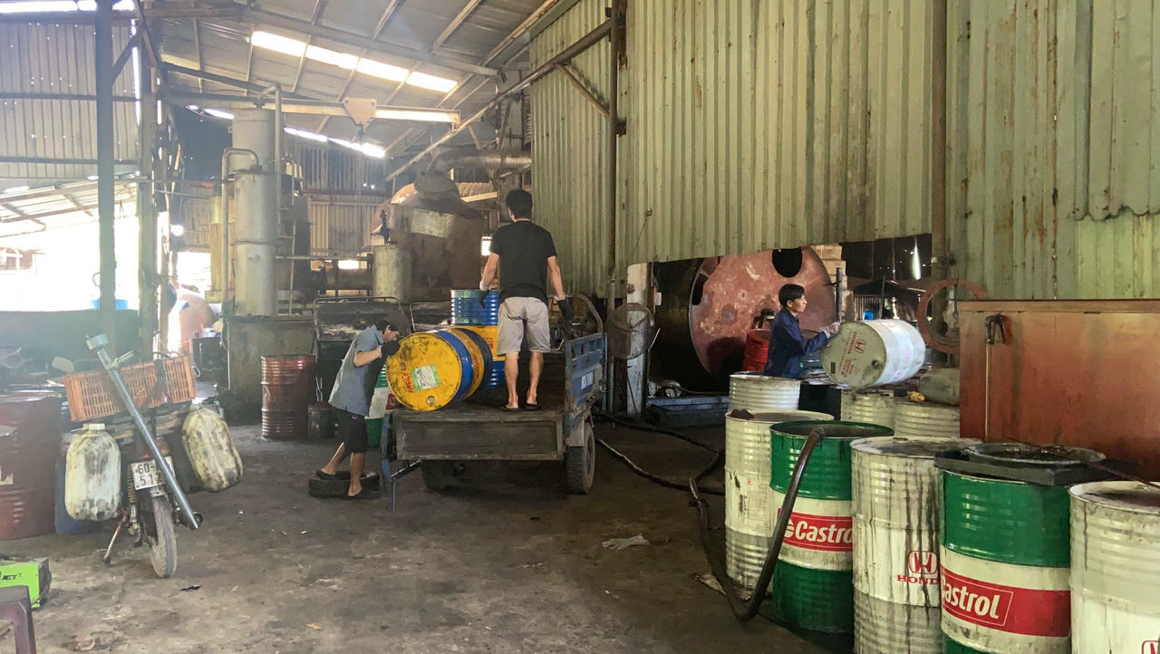 Tại đây, chúng tôi ghi nhận mùi hôi của nhớt cặn, mỡ bị nung chảy bốc lên nống nặc. Trong và ngoài nhà xưởng đen kịt vết dầu, mỡ thải nhất là tại các thùng chứa, bể chứa. Phía sau, một hồ chứa chất lỏng đặc quánh được đào ngay trên nền đất, dẫn trực tiếp chất thải không qua xử lý ra môi trường.