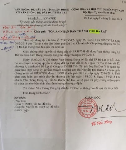 Ngày 20/7/2018, TAND TP Đà Lạt tiếp tục ra Văn bản số 381/CV-TA và 382/CV-TA gửi Văn phòng đăng ký đất đai tỉnh Lâm Đồng, Văn phòng đăng ký đất đai Chi nhánh Đà Lạt và ngân hàng nơi Cty Tiền Tài thế chấp tài sản một lần nữa đề nghị “cung cấp thông tin xóa đăng ký thế chấp, chuyển nhượng tài sản tranh chấp”.