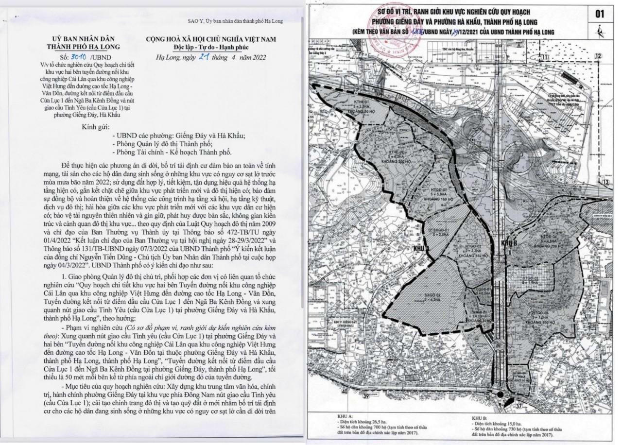Văn bản 3010/UBND của TP Hạ Long và sơ đồ, vị trí về khu vực nghiên cứu quy hoạch tại hai phường Giếng Đáy và Hà Khẩu. |
