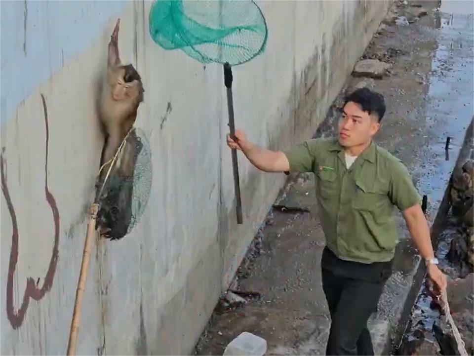 | Lực lượng chức năng vây bắt khỉ hung hăng xuống phố. |