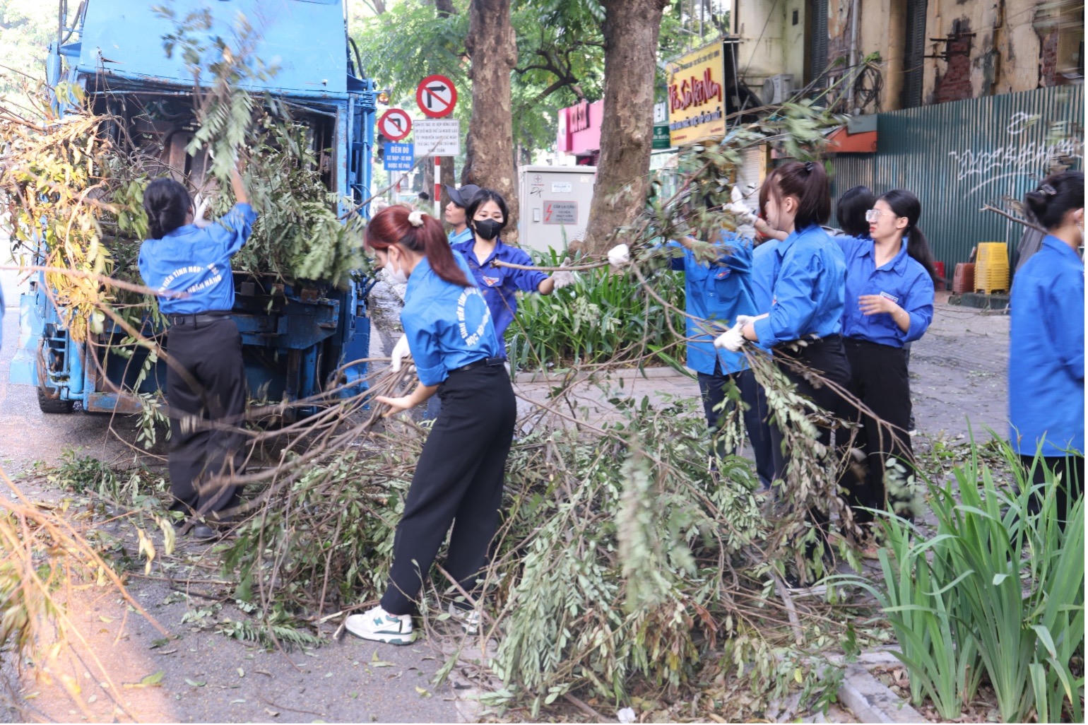 | Rất đông các bạn sinh viên tình nguyện Học viện Ngân hàng tham gia thu gom cành cây, rác thải lên xe chở rác. |