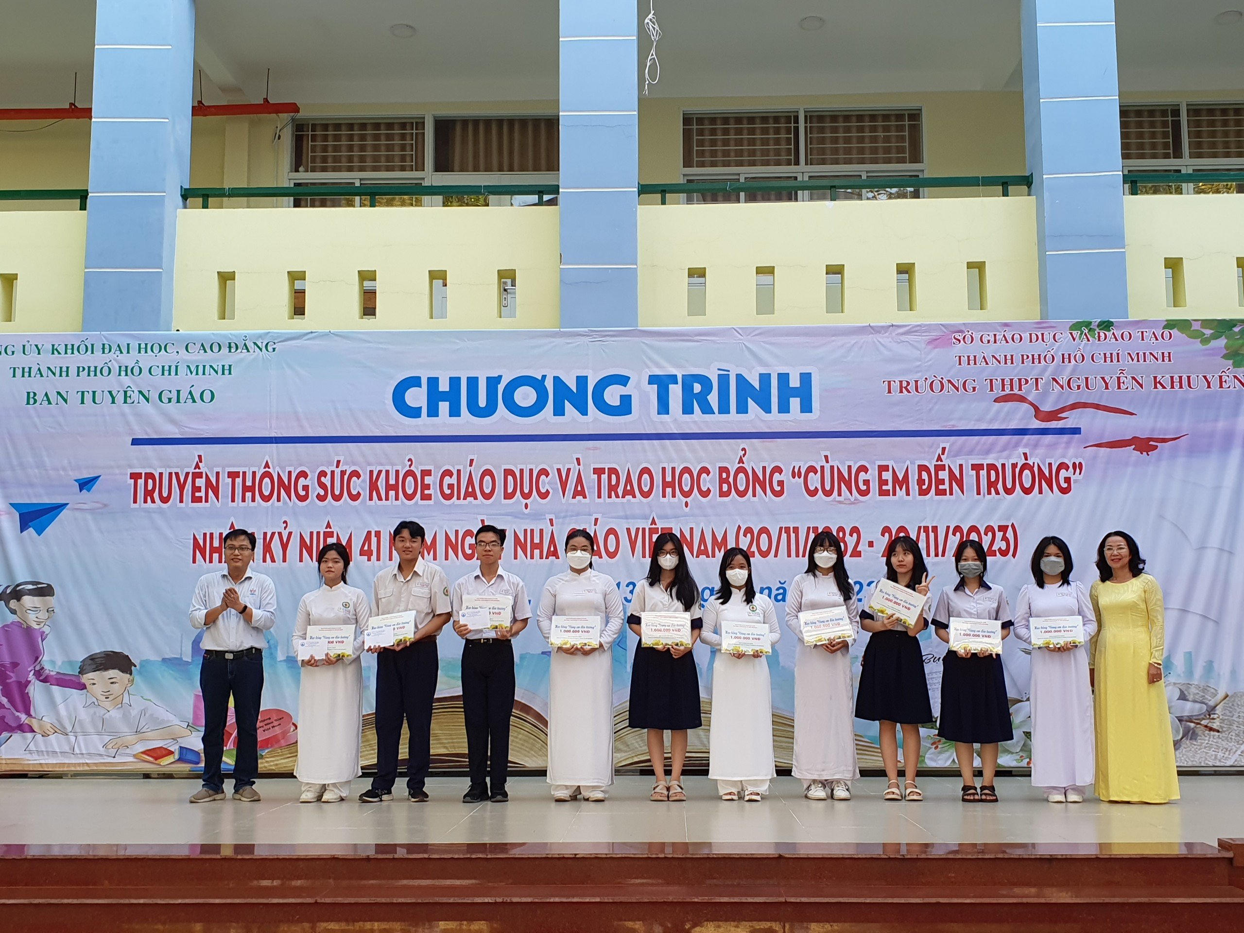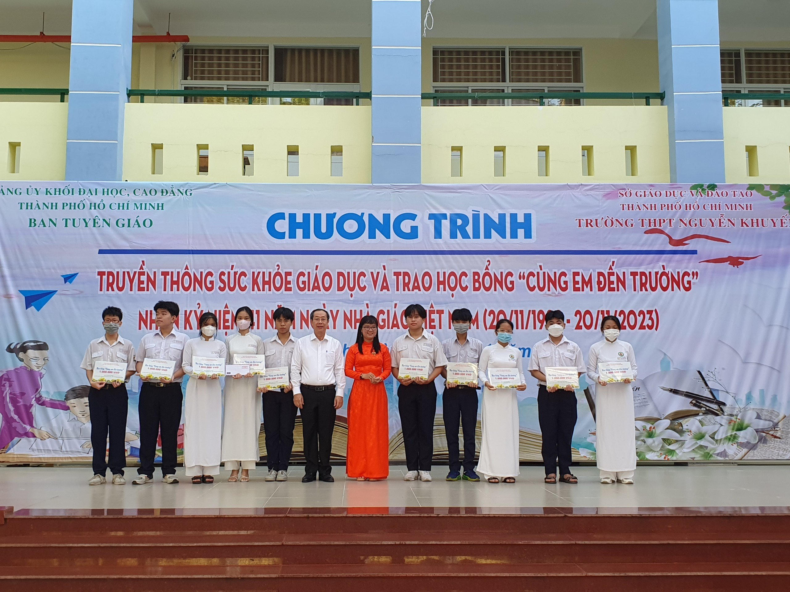 (PLM) - Sáng 13/11, Ban Tuyên giáo Đảng ủy khối Đại học, Cao đẳng TPHCM tổ chức chương trình Truyền thông giáo dục sức khỏe và trao học bổng “Cùng em đến trường” cho học sinh có hoàn cảnh khó khăn nhân kỷ niệm 41 năm Ngày Nhà giáo Việt Nam. Tham dự chương trình có đồng chí Đặng Thùy Khánh Vân, Trưởng Ban Tuyên giáo Đảng ủy Khối; đồng chí Nguyễn Duy Tuyển - Bí thư Chi bộ, Hiệu trưởng trường THPT Nguyễn Khuyến.