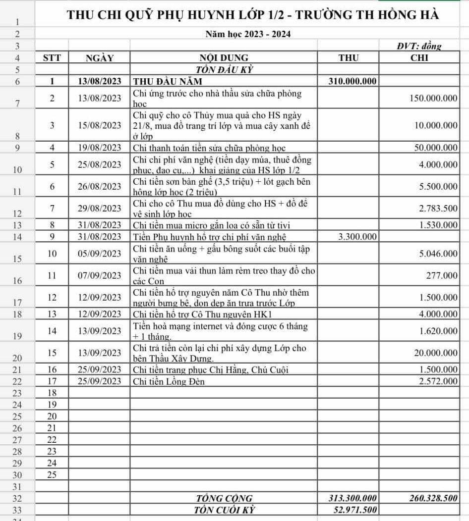 Thế nhưng sau hơn 1 tháng, từ 13/8 đến 25/9, quỹ lớp này chỉ còn lại hơn 50 triệu đồng. Ban đại của lớp đã chi hơn 260 triệu đồng với 17 mục. Trong đó, khoản chi lớn nhất là ứng trước cho nhà thầu sửa chữa phòng học số tiền 150 triệu đồng. Ngoài ra, còn có các khoản chi mua quà cho học sinh, đồ trang trí lớp, chi phí văn nghệ, sơn bàn ghế, lót gạch bên hông lớp học, mua micro gắn loa,…