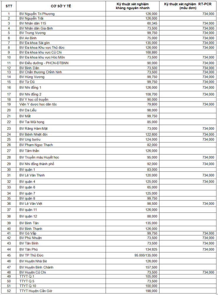 Danh sách các cơ sở y tế công lập công khai giá xét nghiệm COVID-19. |