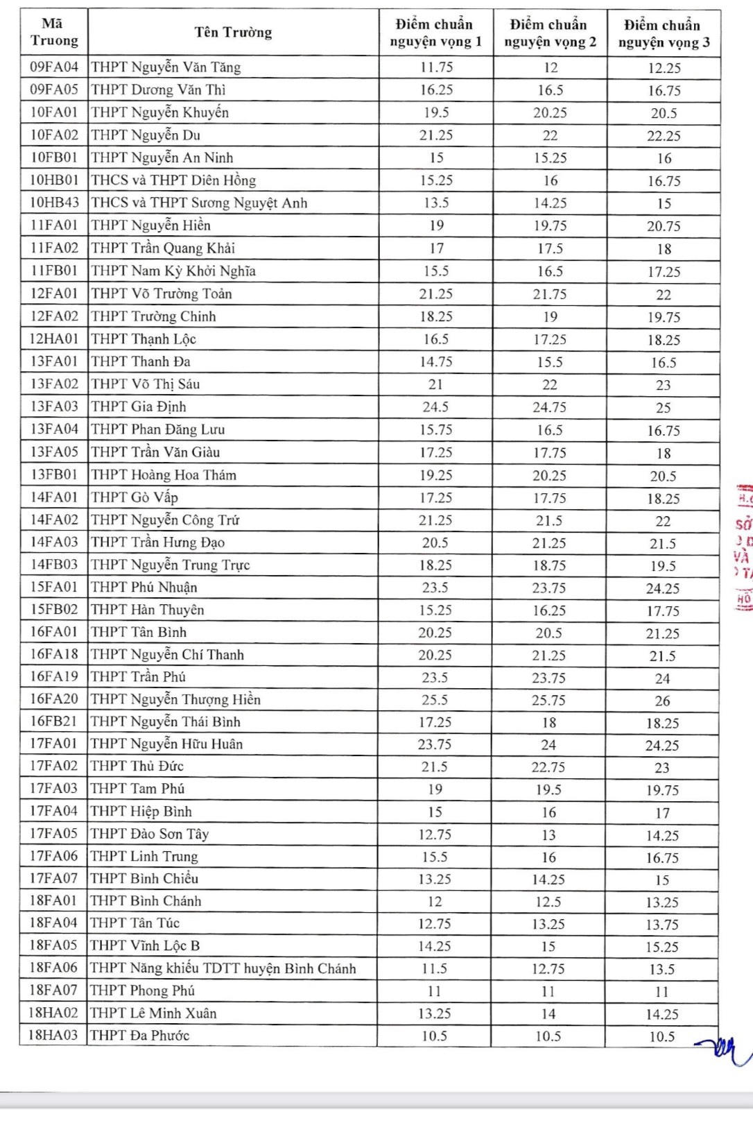 Cụ thể, THPT Nguyễn Thượng Hiền là trường lấy điểm chuẩn cao nhất 25,5 điểm với nguyện vọng 1; tiếp theo đó là các Trường THPT Gia Định 24,5 điểm và THPT Nguyễn Thị Minh Khai với 24,25 điểm; THPT Nguyễn Hữu Huân 23,75 điểm; 3 trường THPT Bùi Thị Xuân, Phú Nhuận, Trần Phú đều lấy 23,5; 2 trường THPT Mạc Đĩnh Chi và Lê Quý Đôn lấy 23,25 điểm.