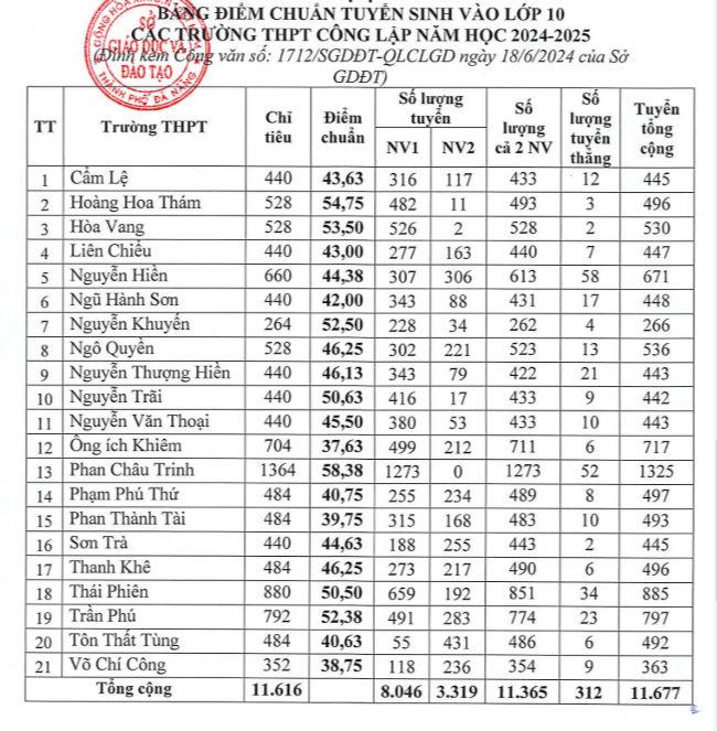 Hôm qua 18/6, Sở Giáo dục và Đào tạo Đà Nẵng vừa công bố điểm chuẩn vào lớp 10 THPT công lập. Theo đó, tổng số học sinh được xét tuyển vào lớp 10 các trường THPT công lập là 11.677 học sinh (không bao gồm 300 học sinh tuyển vào trường THPT chuyên Lê Quý Đôn). Điểm cụ thể như sau:
