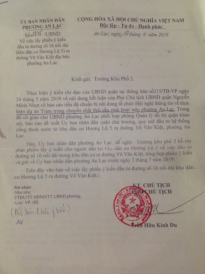 Chưa dừng lại ở sự mập mờ về tên gọi, ngay cả một số văn bản của phường An Lạc cũng bị nghi vấn có dấu hiệu “đánh lận con đen”. Điển hình như Văn bản 2878/UBND ngày 18/6/2019 của UBND phường An Lạc gửi Trưởng khu phố 2. Công văn này ghi rõ là “về việc lấy phiếu ý kiến đầu tư đường số 16 nối dài (KDC Hương lộ 5) ra đường Võ Văn Kiệt”.