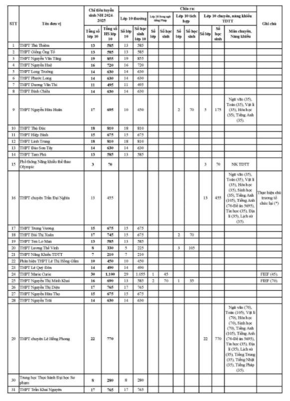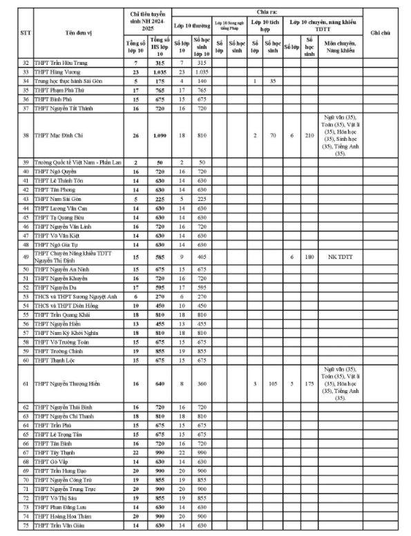 Riêng Trường THCS-THPT Trần Đại Nghĩa, Sở GD&ĐT TPHCM cho biết sẽ ban hành quyết định giao chỉ tiêu tuyển sinh vào lớp 10 năm học 2024-2025 bổ sung cho trường sau khi hoàn thiện Đề án tổ chức lại Trường THPT chuyên Trần Đại Nghĩa trên cơ sở tách Trường THPT chuyên Trần Đại Nghĩa thành Trường THCS- THPT Trần Đại Nghĩa và Trường THPT chuyên Trần Đại Nghĩa.