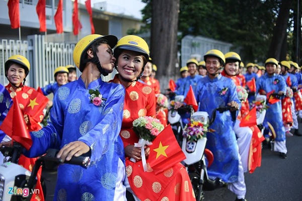 Sáng nay (2/9), kỷ niệm 71 năm Quốc khánh, 100 cặp thanh niên công nhân, giáo viên, người lao động có hoàn cảnh khó khăn đang làm việc trong các khu chế xuất, khu công nghiệp tại TP HCM sánh bước bên nhau trong ngày vui, ngày hạnh phúc nhất đời trong một Lễ cưới tập thể được Thành Đoàn tổ chức. Đám cưới tập thể của 100 cặp vợ chồng trẻ hôm nay tôn vinh những nét đẹp truyền thống của đám cưới Việt Nam