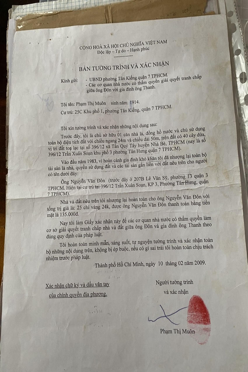 Việc mua bán thông qua hình thức viết giấy tay được bà Muôn ký, lăn dấu vân tay dưới sự chứng kiến của ông Nguyễn Văn Viên (SN 1925) tổ trưởng tổ dân phố thời điểm đó và ông Nguyễn Thanh Bạch (SN 1940) người địa phương cư trú gần thửa đất bà Muôn.