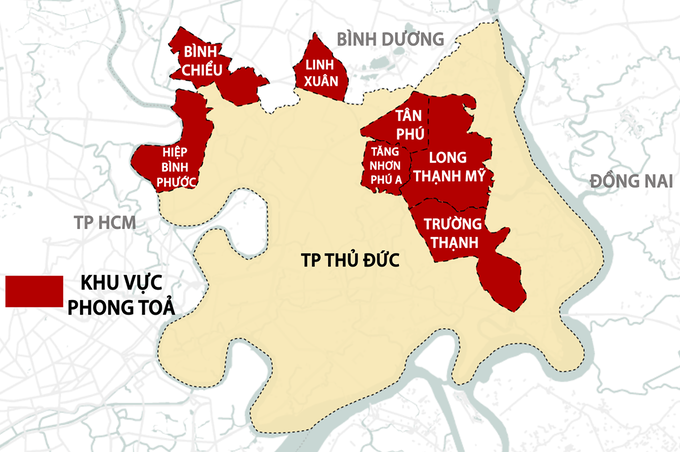 Trước đó, TP Thủ Đức đã phong toả 5 phường gồm: Tân Phú, Bình Chiểu, Trường Thạnh, Tăng Nhơn Phú A và Long Thạnh Mỹ. Đến nay Thủ Đức đã phong toả 7/34 phường để phòng chống COVID-19.