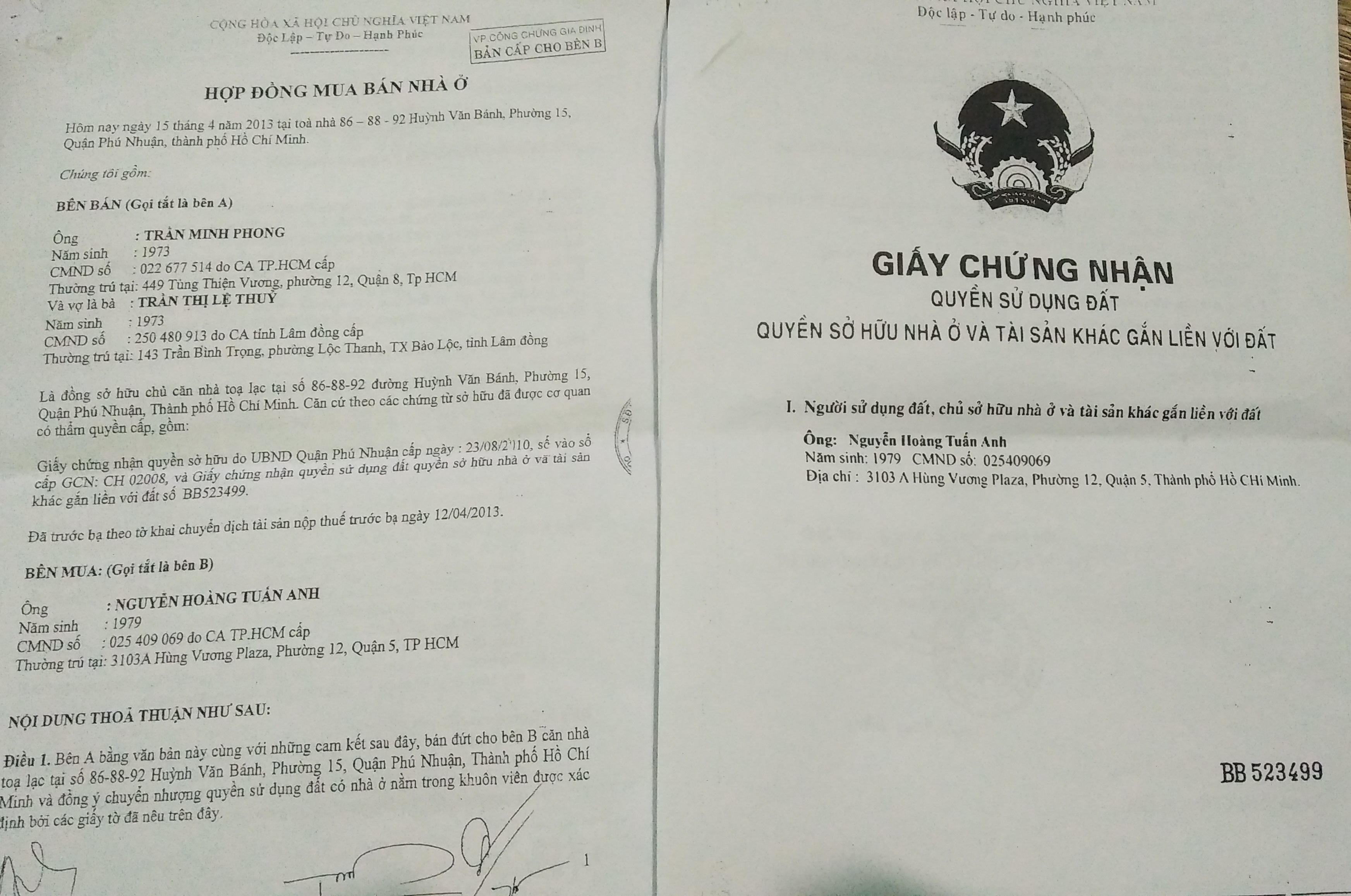 Làm việc với Thanh tra Sở LĐTB và XH TP. HCM về vấn đề đơn tố cáo mà ông Phong nói đến, ông Trương Quang Khánh, Thanh tra viên, người thụ lý hồ sơ cung cấp cho PV một Hợp đồng mua bán căn nhà số 88 – 88 – 92 Huỳnh Văn Bánh giữa vợ chồng ông Phong và ông Tuấn Anh được ký kết vào ngày 15/04/2013 có công chứng với giá 83 tỷ đồng và một GCNQSDĐ do ông Tuấn Anh đứng tên căn nhà nói trên. Cả hai loại giấy tờ này đều là bản photo.