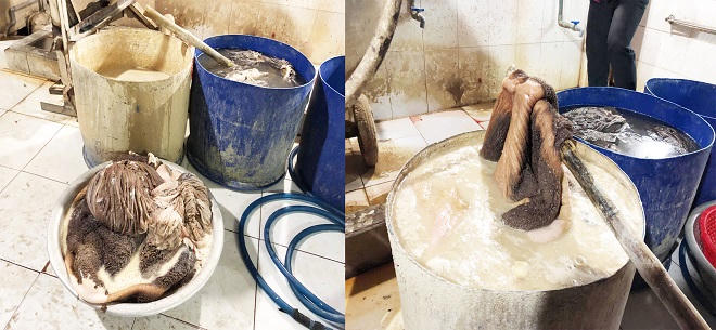 “Có 3 thùng nhựa lớn đầy nước trắng đục ngâm hàng chục ký sách bò đã chuyển hẳn sang màu đen, bốc mùi hôi thối. Một máy trộn bê tông loại nhỏ được cắm điện sẵn bên cạnh. Ngoài ra, cơ sở cũng đang phân loại hàng chục kg cuống bò, tim bò, lòng bò ngay trên nền dụng cụ cáu bẩn.