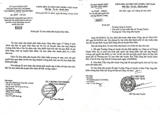 | Công văn Văn phòng UBND TP.HCM yêu cầu UBND huyện Hóc Môn xem xét trả lời ông Huỳnh Cường từ tháng 10/2016. Và công văn chỉ đạo của UBND huyện Hóc Môn về việc giải quyết đơn thư của ông Huỳnh Cường. |