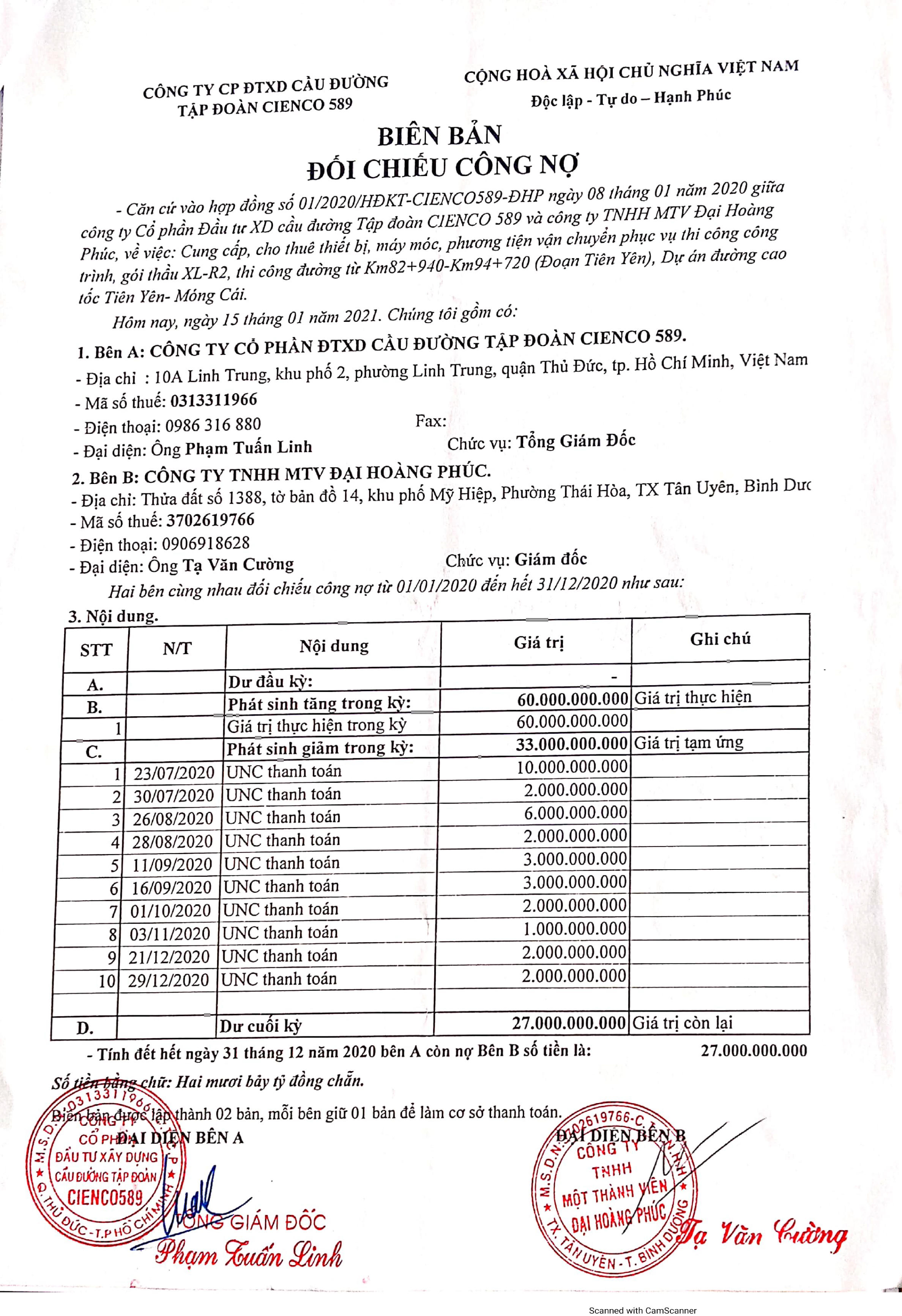 Biên bản đối chiếu công nợ cho thấy Cty CIENCO 589 nợ Cty Đại Hoàng Phúc 27 tỷ đồng. |