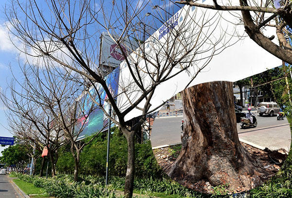 Cách đây vài tháng, trên đường Trường Sơn, thuộc phường 2, quận Tân Bình có 6 cây me tây trồng xòe tán rợp mát... bỗng nhiên khô héo, rụng lá rồi chết khô. Khi đó, người qua đường phát hiện ra sau lưng 6 cây me khô là một tấm biển quảng cáo rất lớn. Có liên quan gì đến nhau không? Một người dân buôn bán nước giải khát gần đó cho biết: Chắc chắn họ đổ hóa chất xuống nên cây mới chết đồng loạt và cùng một dãy như vậy.