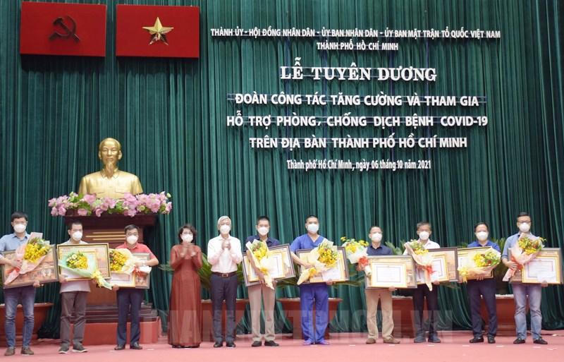 (PLVN) - Sáng 6/10, Thành ủy, UBND, Ủy ban Mặt trận Tổ quốc Việt Nam TP Hồ Chí Minh đã tổ chức “Lễ tuyên dương Đoàn công tác tăng cường và tham gia hỗ trợ phòng, chống dịch bệnh COVID-19 trên địa bàn thành phố”.