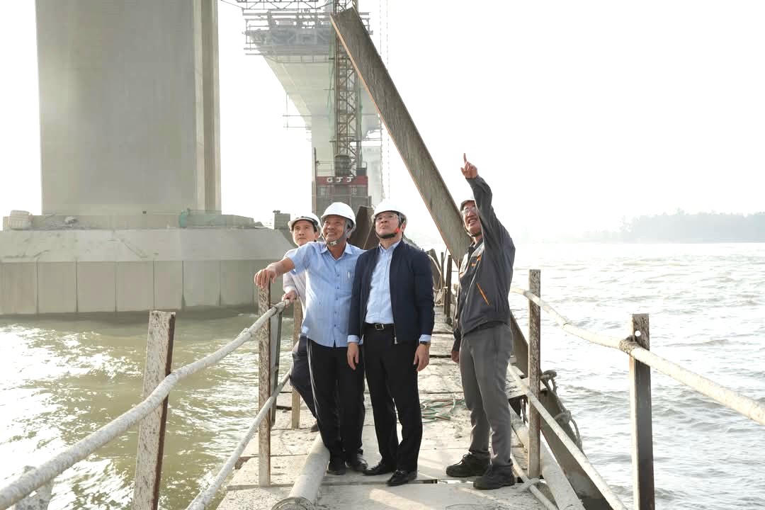 Lãnh đạo TP Huế kiểm tra tiến độ dự án cầu qua cửa Thuận An. (Ảnh: Thùy Nhung) |