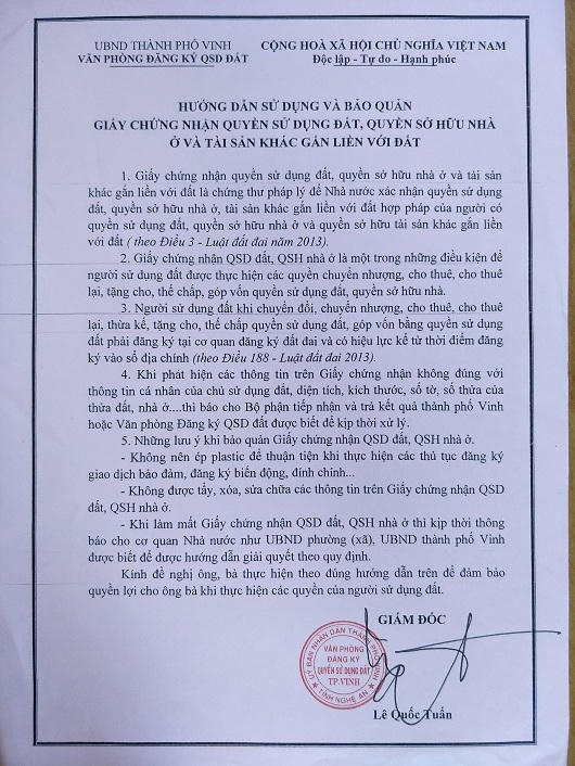 Tuyên truyền, hướng dẫn cho nhân dân biết cách bảo quản sử dụng Giấy chứng nhận đúng quy định, kê khai thuế phi nông nghiệp hay các quyền và nghĩa vụ của người sử dụng đất thông qua phát tờ rơi sau khi nhận Giấy chứng nhận tại một cửa, nhằm nâng cao ý thức hiểu biết pháp luật về đất đai cho nhân dân.