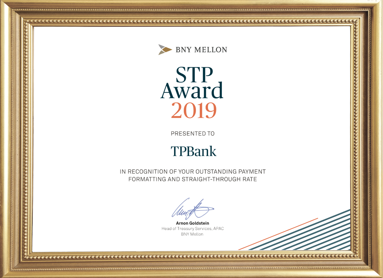 Giải thưởng Chất lượng thanh toán quốc tế xuất sắc được Ngân hàng Bank of New York Mellon (BONY) của Mỹ trao tặng cho TPBank với tỷ lệ đạt chuẩn STP (Straight Through Processing) gần 98%. STP là một tiêu chí quan trọng để đánh giá chất lượng thanh toán quốc tế của các ngân hàng trên thế giới với các tiêu chuẩn khắt khe của BONY dựa trên số lượng, tốc độ và sự chuẩn xác về chất lượng thanh toán quốc tế.