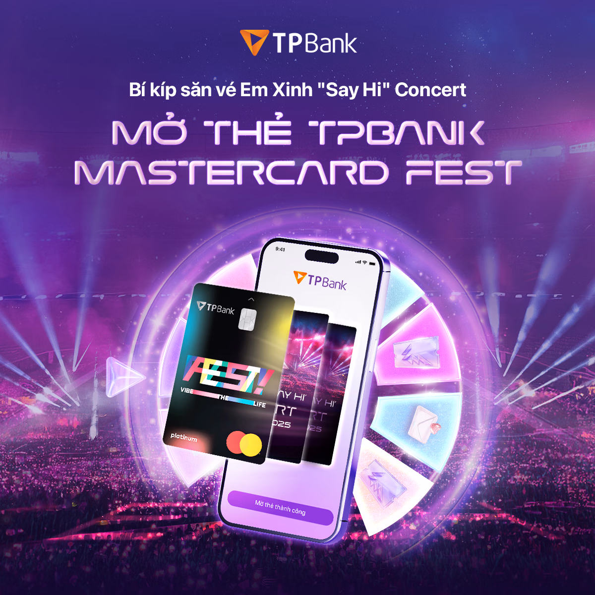 Cụ thể, từ nay đến hết ngày 30/9, chỉ cần mở thẻ TPBank Mastercard FEST, bạn sẽ có cơ hội được tặng vé tham dự Em Xinh “Say Hi” Concert đêm 2 tại Hà Nội (ngày 11/10). Vé được chia làm 2 đợt trao thưởng, nên mở càng sớm, cơ hội trúng vé càng cao. Nếu số lượng mở thẻ quá lớn, TPBank sẽ ưu tiên những khách hàng chi tiêu bằng thẻ đạt mốc 3 triệu đồng sớm nhất mỗi tuần.