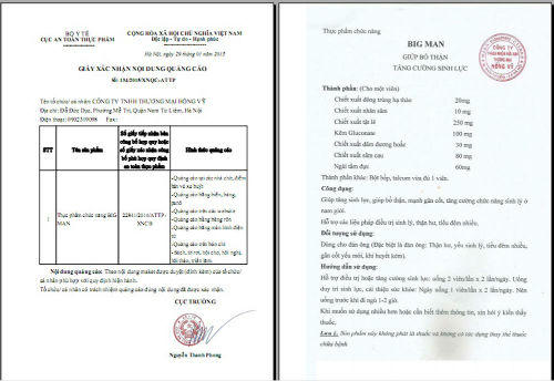 Trong giấy xác nhận nội dung quảng cáo số 134/2015/XNQC - ATTP do Cục trưởng Cục An toàn Thực phẩm (Bộ Y tế) ký ngày 29/1/2015 thì sản phẩm TPCN Big Man được quảng cáo dưới các hình thức là: “Quảng cáo tại các nhà chờ, điểm bán vé xe buýt; Quảng cáo bằng biển, bảng, pano; Quảng cáo trên các website; Quảng cáo bằng băng rôn; Quảng cáo bằng màn hình điện tử; Quảng cáo trên báo chí; Sách, tờ rơi, hội chợ, hội nghị, hội thảo, triển lãm”.