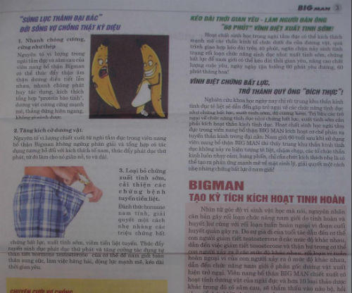 Tại trang 2 của ấn phẩm này là phần hướng dẫn cách sử dụng và những lời khen ngợi, tâng bốc sản phẩm viên nang bổ thận Big Man dưới hình thức là những đoạn “phỏng vấn nhân vật”. Riêng nội dung trong trang 3 và 4 của ấn phẩm này là những bài viết quảng cáo, thổi phồng công dụng của sản phẩm Big Man một cách rất thô tục như: “Súng lục thành đại bác”, “Nhanh chóng cương cứng như thép”, “Tăng kích cỡ dương vật”, “Big Man tạo kỳ tích kích hoạt tinh hoàn”, “Thảm nhất xuất tinh sớm, yêu nhất viên nang bổ thận Big Man”…