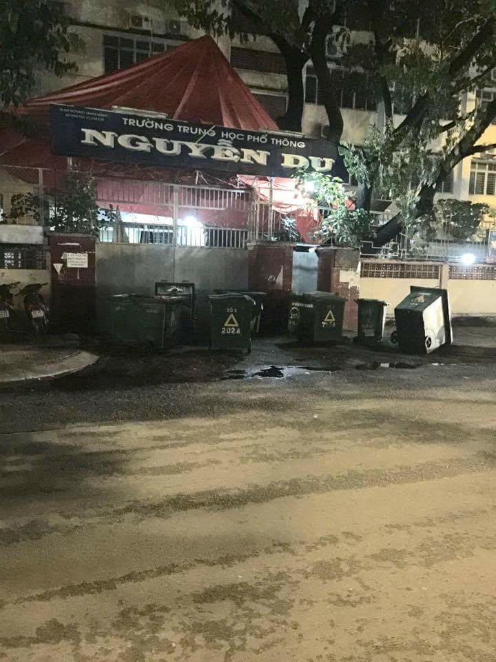 Theo PV báo PLVN ghi nhận, tại thời điểm lúc 20 giờ trước cổng trường THPT Nguyễn Du, hàng chục thùng chứa rác để ngổn ngang, nước ép rác thải chảy lênh láng trên lòng lề đường kèm theo đó là mùi hôi thối nồng nặc bốc lên…