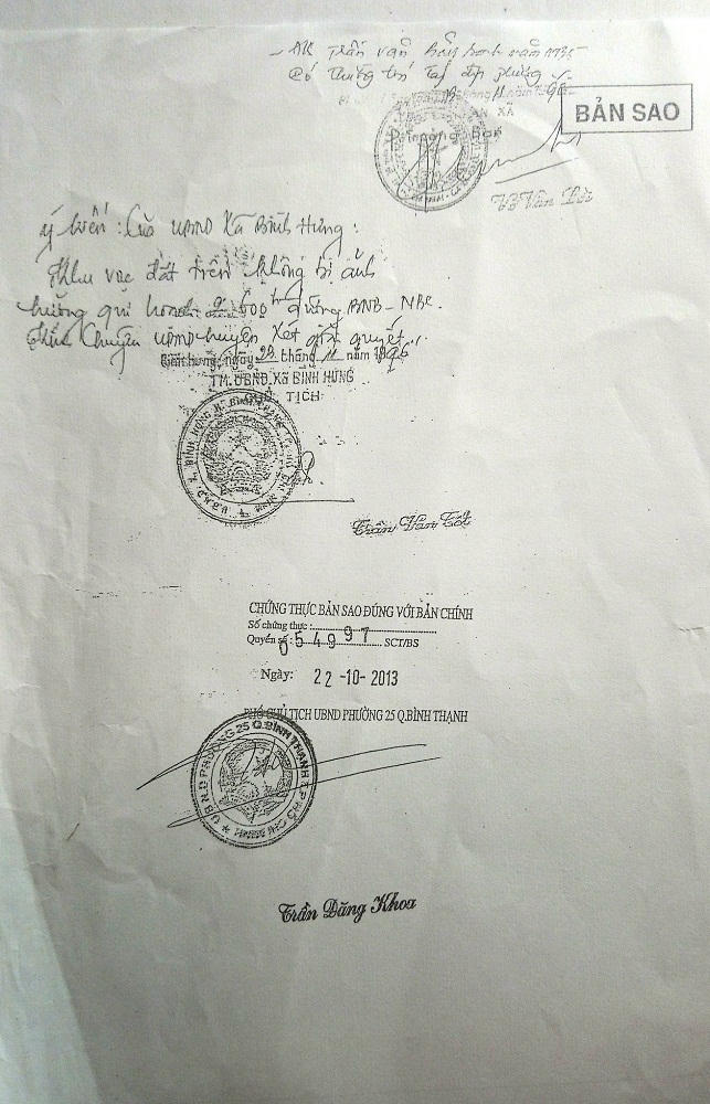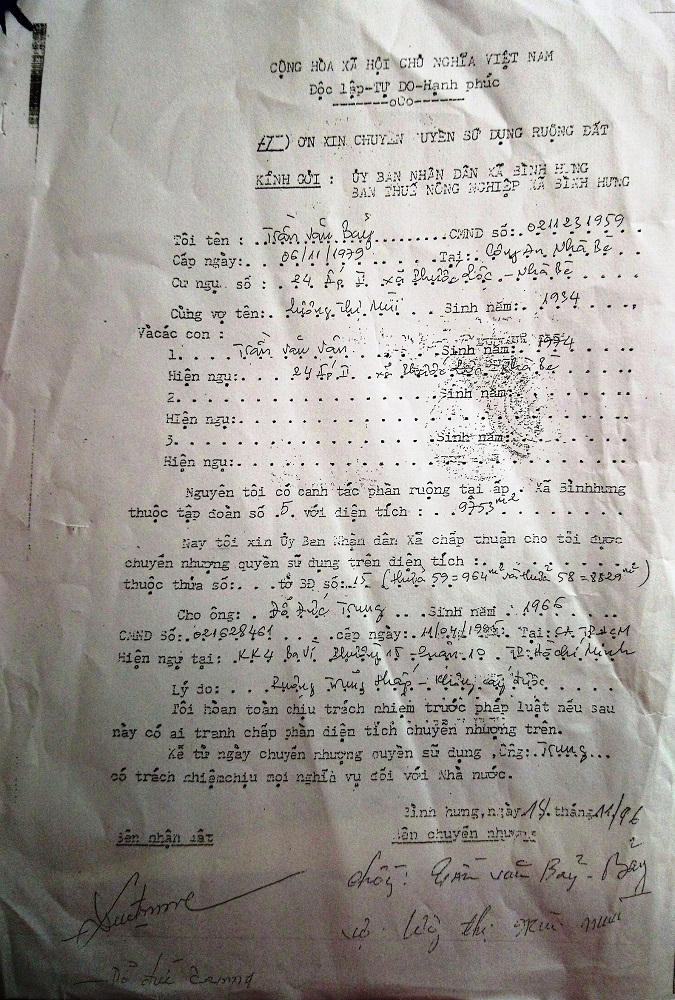 Ngày 18/11/1996, ông Bảy - bà Mùi có “Đơn xin chuyển quyền sử dụng ruộng đất” gửi UBND xã Bình Hưng, nội dung: “Nguyên tôi có canh tác phần ruộng tại xã Bình Hưng thuộc Tập đoàn 5 với diện tích 9.793m2. Nay tôi xin UBND xã chấp thuận cho tôi được chuyển nhượng QSDĐ trên diện tích (thửa 59 = 964m2 và thửa 58 = 8.829m2) tờ bản đồ số 15 cho ông Đỗ Đức Trung sinh năm 1966, ngụ Ba Vì, phường 15, quận 10, TP.HCM. Tôi hoàn toàn chịu trách nhiệm trước pháp luật nếu có ai tranh chấp phần diện tích chuyển nhượng trên…”. Đơn trên đã được Công an xã Phước Lộc, huyện Nhà Bè xác nhận ngày 19/11/1996: “Đ/s (đương sự) Trần Văn Bảy, sanh năm 1935 có thường trú tại địa phương” và UBND xã Bình Hưng xác nhận ngày 23/11/1996:“Khu vực đất trên không bị ảnh hưởng quy hoạch 2.600 ha đường BNB -NBC (Bắc Nhà Bè - Nam Bình Chánh). Kính chuyển UBND huyện giải quyết”.