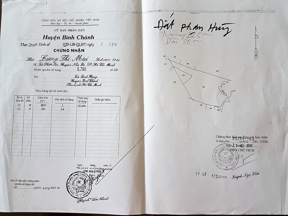 Dù đã xác nhận rõ việc ông Bảy - bà Mùi chuyển nhượng toàn bộ khu đất cho ông Trung năm 1996 nhưng ngày 12/9/1998, UBND xã Bình Hưng lại có tờ trình số 40/TT-UB “cấp Giấy chứng nhận QSDĐ” cho 92 hộ dân; trong số này có hộ bà Mùi theo Đơn xin đăng ký ngày 13/8/1994 (?!). Ngày 27/11/1998, Phó Chủ tịch UBND huyện Bình Chánh lúc đó là ông Huỳnh Văn Chính đã ký cấp Giấy chứng nhận QSDĐ số 530/QSDĐ cho hộ bà Lương Thị Mùi phần đất 9.793m2.