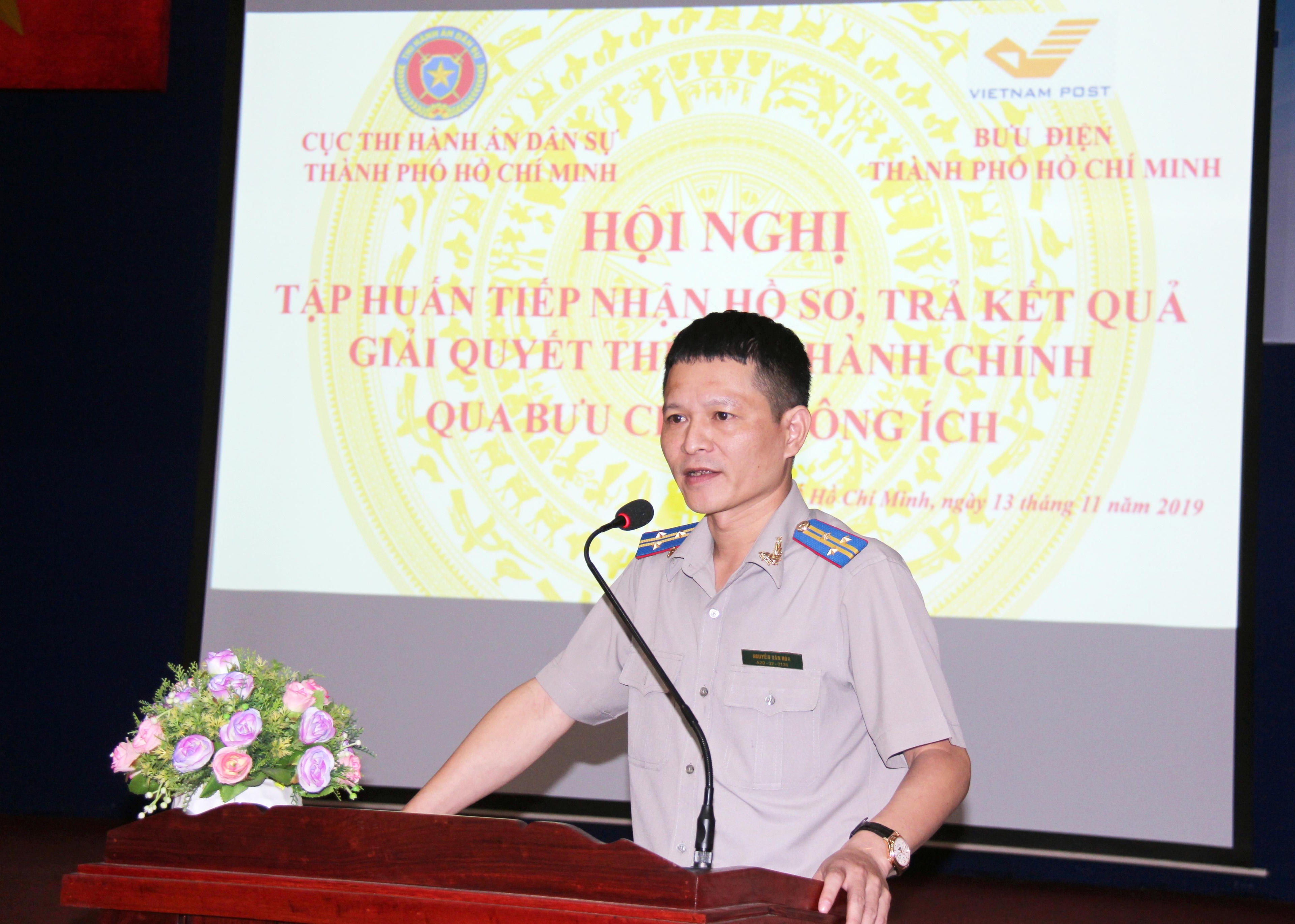 (PLVN) -Sáng 13.11, tại Thành phố Hồ Chí Minh, Cục Thi hành án dân sự Thành phố (THADS) Hồ Chí Minh phối hợp với Bưu điện Thành phố tổ chức hội nghị tập huân tiếp nhận hồ sơ; trả kết quả giải quyết thủ tục hành chính (TTHC) qua bưu chính công ích. Ông Nguyễn Văn Hòa, Phó cục trưởng Cục THADS thành phố dự và chỉ đạo hội nghị.
