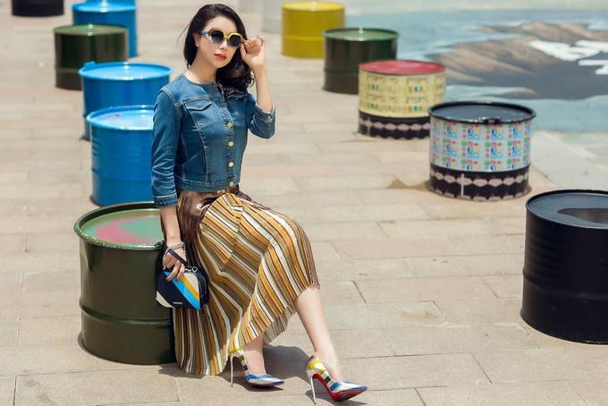 Trà Ngọc Hằng kết hợp giữa chất liệu jeans cứng cáp cùng đầm xòe xếp ly nhẹ nhàng.
