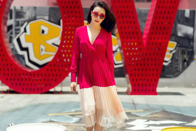 Váy xếp ly hai tông hồng nhạt, hồng đậm tôn làn da trắng của cô.