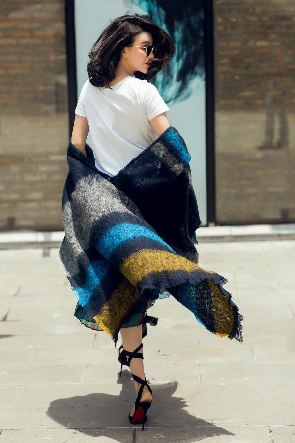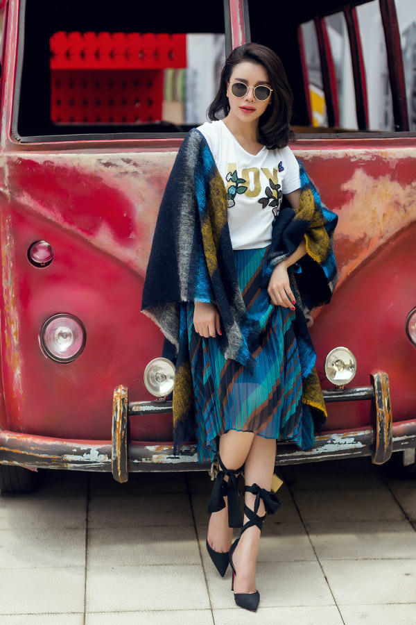 Chỉ với áo thun và váy voan, cô tạo nên set đồ cá tính nhờ phối hợp phụ kiện khăn choàng.